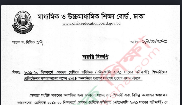 জানা গেছে, ২০১৯-২০ শিক্ষাবর্ষের একাদশ শ্রেণিতে ভর্তিকৃত যেসব শিক্ষার্থী রেজিস্ট্রেশন করতে পারেনি শুধুমাত্র তারা এ সময়ে রেজিস্ট্রেশনের সুযোগ পাচ্ছেন। ১ নভেম্বর থেকে আগামী ৯ নভেম্বরের মধ্যে অনলাইনে ইএসআইএফ পূরণ করে তাদের রেজিস্ট্রেশন সম্পন্ন করতে বলেছে ঢাকা বোর্ড।