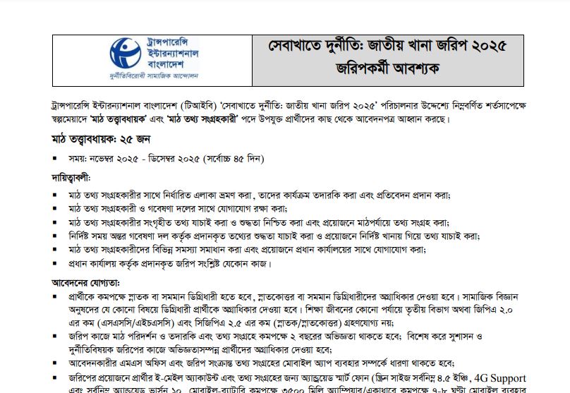Transparency International Bangladesh (TIB) is the Bangladeshi branch of Berlin-based Transparency International, a civil society organization dedicated to fighting corruption. Transparency International Bangladesh Job is one among the other private jobs nowadays. By doing TIB job you can build your bright future. Transparency International Bangladesh (TIB) publishes job circulars from time to time for recruitment of numerous manpower in various categories.